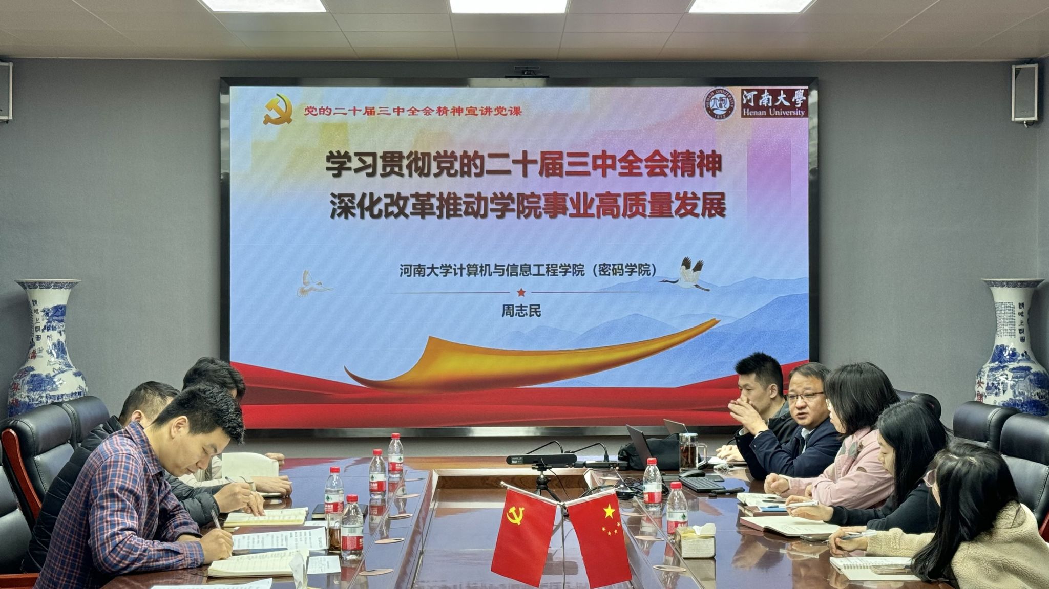 会上,副院长左宪禹领学传达中央统战部、教育部《关于加强高校统一战线工作的意见》文件精神;党委书记周志民传达学习《中共中央关于加强新时代党外知识分子思想政治工作和无党派代表人士队伍建设的意见》文件精神和学校《关于开展系列专题组织生活的通知》文件要求,并以《学习贯彻党的二十届三中全会精神 深化改革推动学院事业高质量发展》为主题做党的二十届三中全会精神宣讲党课。随后,各党支部书记分别就未来三年党支部建设工作思路和拟建设成效做了汇报。