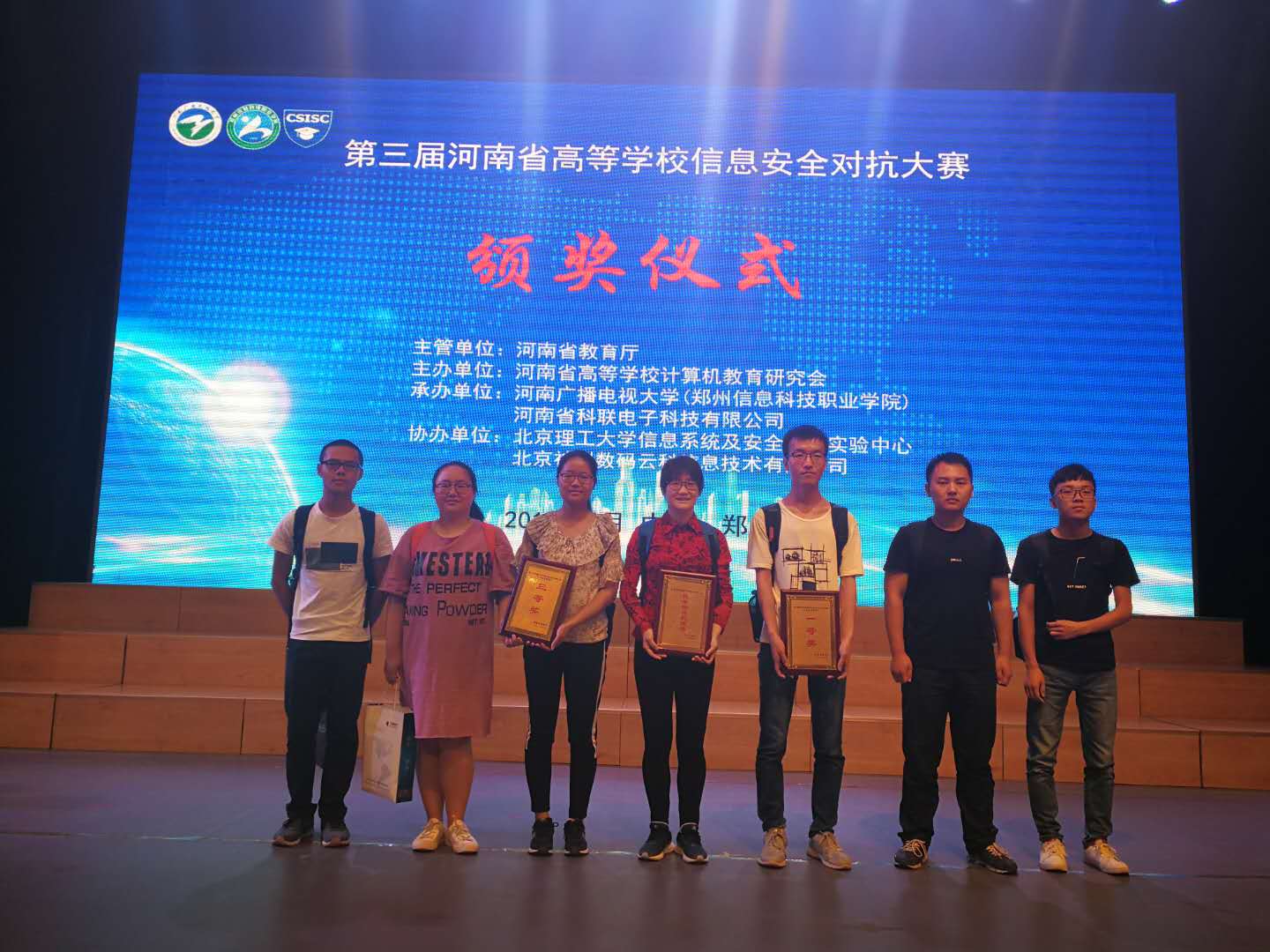 2018年6月24日上午,第三届河南省高等学校信息安全对抗大赛在河南省广播电视大学实训楼举行,共124支队伍367名“白客”参加此次竞赛。最终,风月文学网 派出的3支队伍表现突出,其中北风队的“杨罡、潘鹏宇、闫礼”3位同学获得省赛一等奖,另外1队获得省赛三等奖。