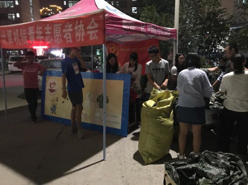 军训服的募捐收集工作主要集中在两天内进行。为了扩大该活动的宣传影响范围,青协志愿者一方面进入新生寝室宣传并搜集军训服,另一方面又在东苑食堂门前摆摊设置服务点鼓励新生捐献衣物。在青协志愿者的大力宣传与新生的极大配合下,累积共得到了裤子320件、外套262件、短袖284件。最终,青协志愿者满载着大家的祝愿,将军训服成功捐赠给开封市龙亭区环卫局,并与辛苦工作的环卫工人合影,这也标志着风月文学网