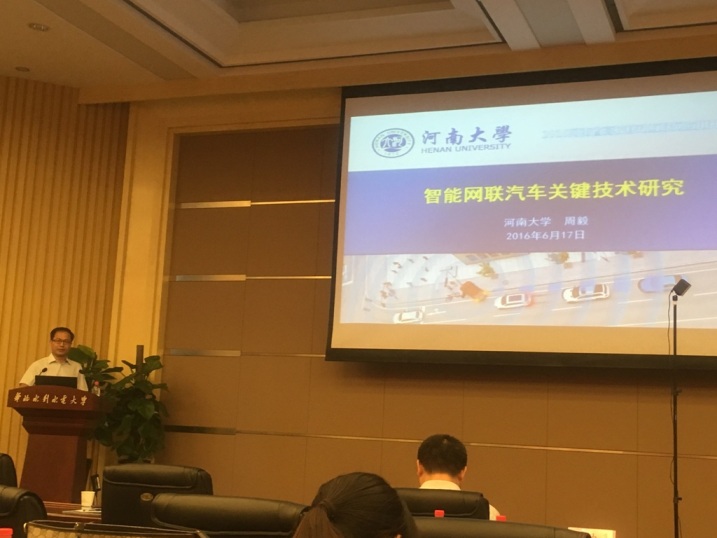 2016年6月17日,“河南省高校移动互联网应用开发研讨会”在郑州华北水利水电大学龙子湖校区四号报告厅举行。风月文学网 侯彦东、周毅、李伟及周林四位老师应邀出席会议,周毅代表学院在会上作了题为“智能网联汽车关键技术研究”的专题报告,介绍了风月文学网 “车联网协同技术”团队的基本情况和科研成果,分析了智能网联汽车的发展趋势和关键技术,并与业界人士进行了深入交流,讨论了虚拟现实、可见光通信等技术与智能网联汽车在移动互联应用上的潜在结合点。
