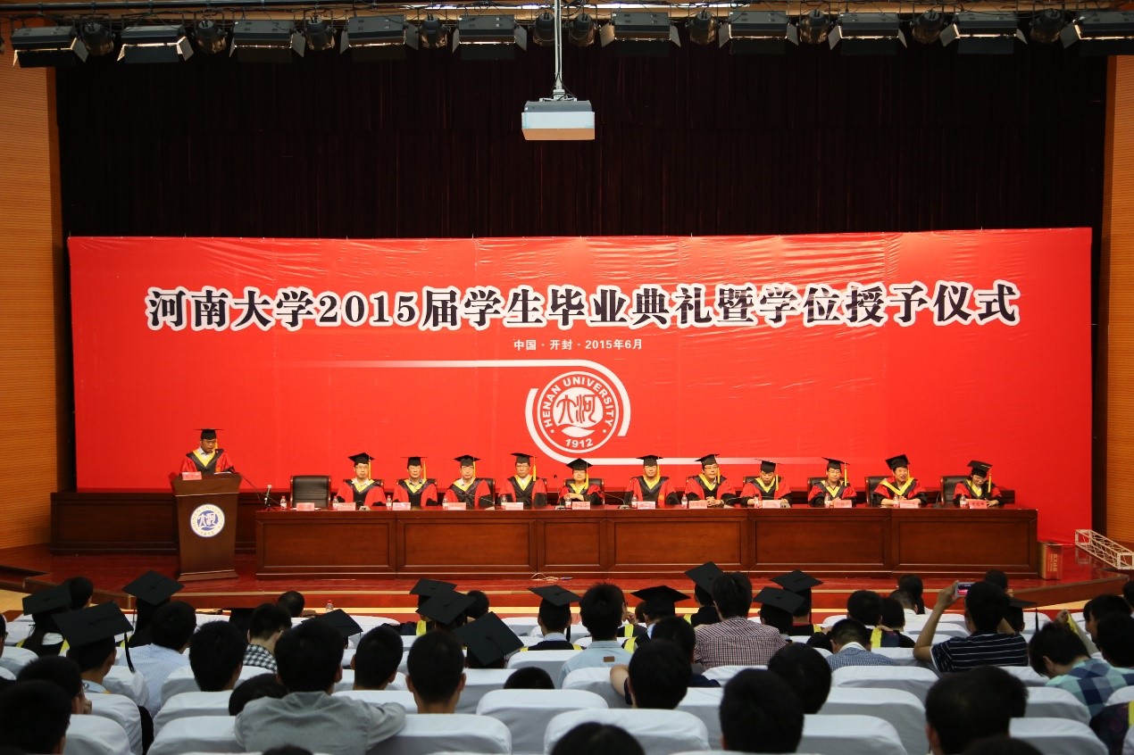 2015届本科毕业生援正流苏,向他们颁发学位证书并合影留念。