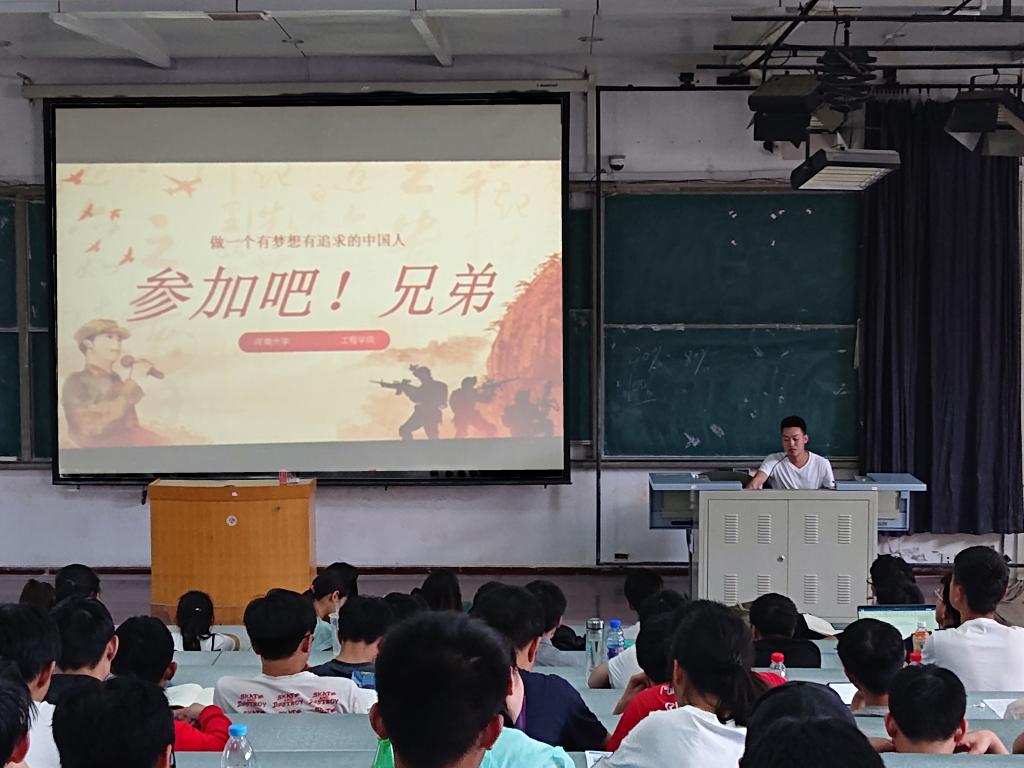 2019年大学生入五征集工作方案》,从应征入伍基本条件、报名流程以及大学生入伍可享受的优待政策等几方面入手,并播放了2019年征兵工作宣传片,使同学们全面了解了大学生征兵工作。随后,2015级退役复学的陈孙坊同学结合切身经历和感受,给同学们分享了军营生活的方方面面,起到积极动员作用。