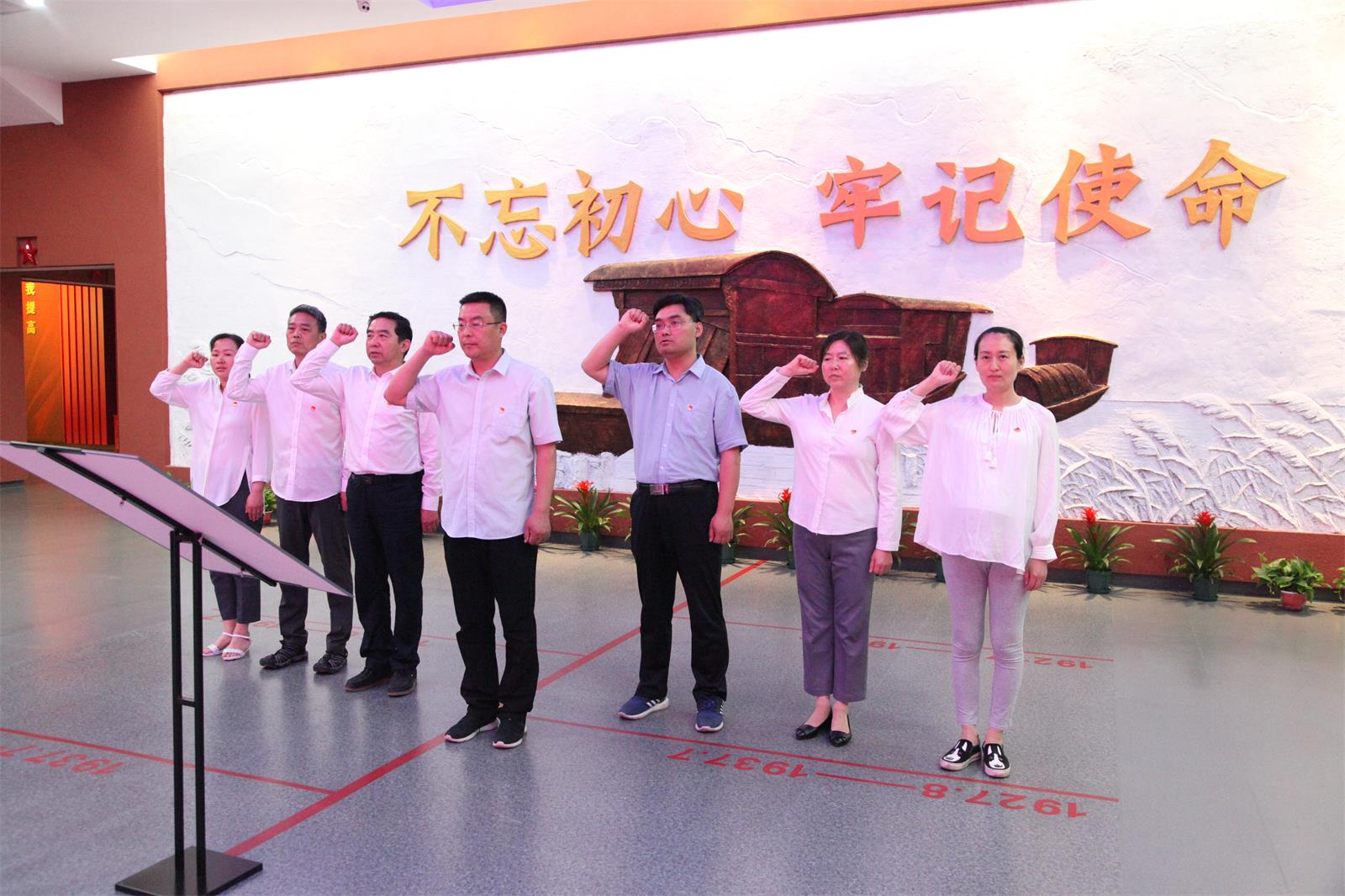 之后,党员们在“5+N”主题党日活动室集中交纳了当月党费。随后,党员们来到以“不忘初心牢记使命”为主题的序厅,在吕冰同志领誓下,全体党员举起右拳,重温了入党誓词。最后,党员们郑重的在共产党员承诺书上签下自己的名字。