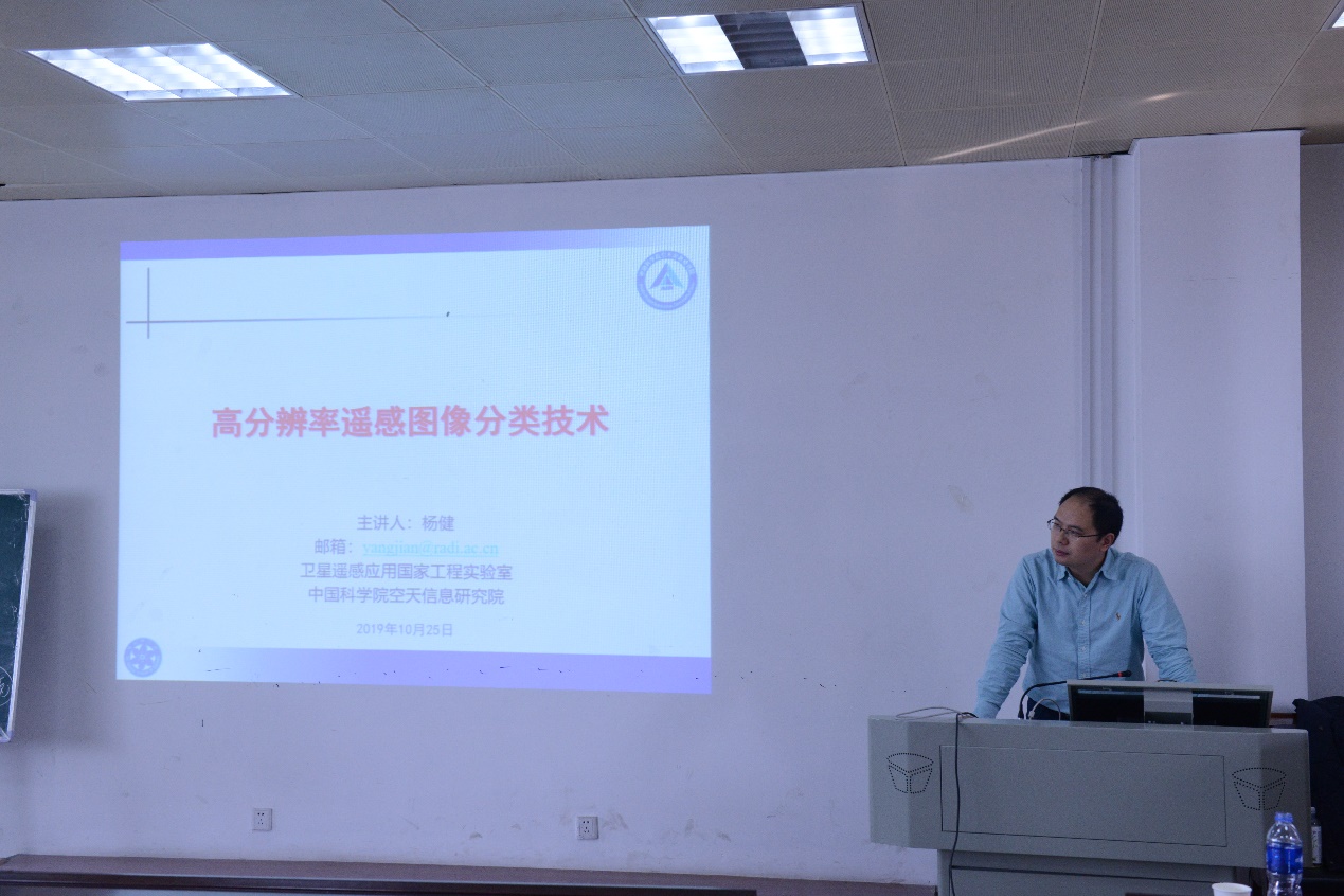 杨健博士首先介绍了高分辨率遥感图像分类与目标检测识别是当前遥感应用中的重要内容,并结合目标时空特征和航天遥感数据工程模型,讲述了面向应用场景的遥感地表覆盖分类体系和技术流程。同时细致地讲解了地物目标分类特征库设计及遥感大数据分类工程化实现方案,面向植被检测、水域提取、云和岩土检测、人工地物提取等应用场景下的模型算法设计和实验结果分析,以及应用高分辨率遥感卫星影像进行应急监测与信息支持的案例。报告深入浅出,用日常生活中的例子将原本专业化的遥感卫星分类技术讲解地通俗易懂、生动有趣。报告在师生们热烈的掌声中结束。