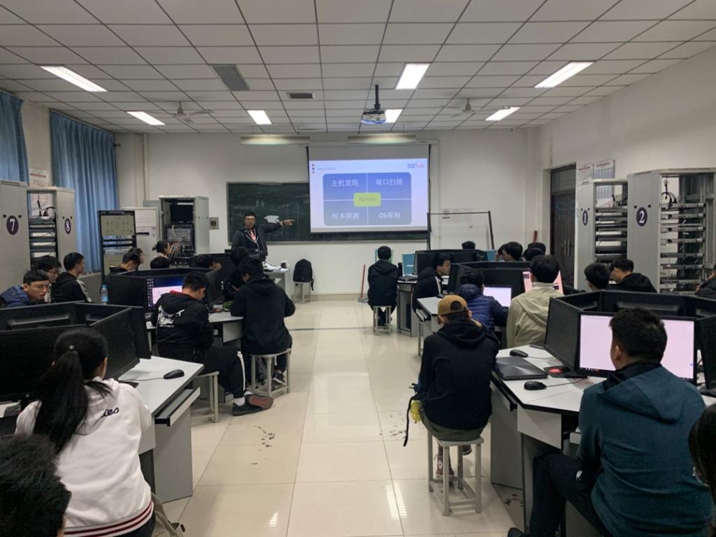 企业专家对学生进行了安恒集团企业方面的培训,安恒培训经理马腾飞一直致力于通过高质量的人才培养推动安恒集团事业的发展。在为期一天的培训中,马老师为同学们剖析了目前安全行业的现状以及行业的发展前景和集团的创业历程,激励全体学生要不畏艰难困苦,不断在逆境中成长。马老师向同学们展示了信息安全漏洞检测过程中的各种技术,提高了学生们的学习水平。
