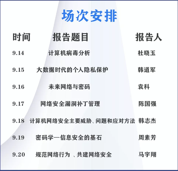 本次网络安全知识系列讲座自9月14日起,每日一场,共计举办7场,主题包括:《计算机病毒分析》、《大数据时代的个人隐私保护》、《未来网络与密码》、《网络安全漏洞补丁管理》、《计算机网络安全主要威胁、问题和应对方法》、《密码学—信息安全的基石》、《规范网络行为、共建网络安全》。