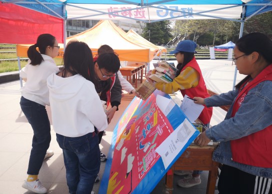 青年志愿者们积极响应,协助活动承办单位之一——开封市图书馆,在我校金明校区进行宣传动员和图书收集。