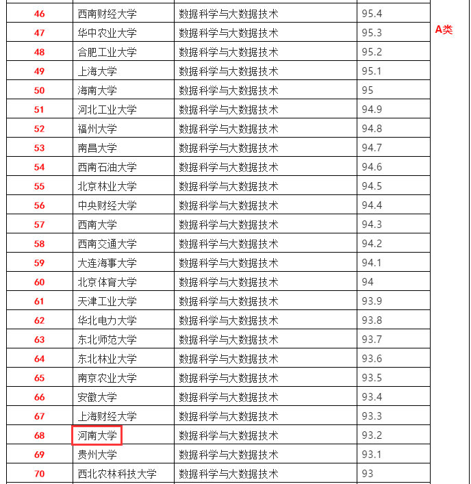 排名68,位列A类,表示数据科学与大数据专业的人才培养和专业建设综合实力总体水平位居全国高校前列。