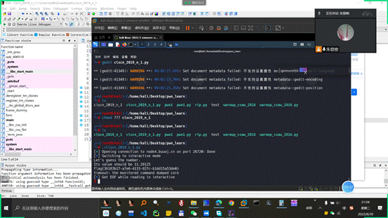 李淦埔同学则给大家讲解了IDA的使用方法,快速找到一个程序的main函数,修改程序代码,提取数据,然后讲解了一些脱去upx壳的方法,逆向中常见的加密算法以及如何识别它们,接着演示了使用ida调试Windows和Linux程序,最后讲解python逆向和逆向中常见的几种题型。