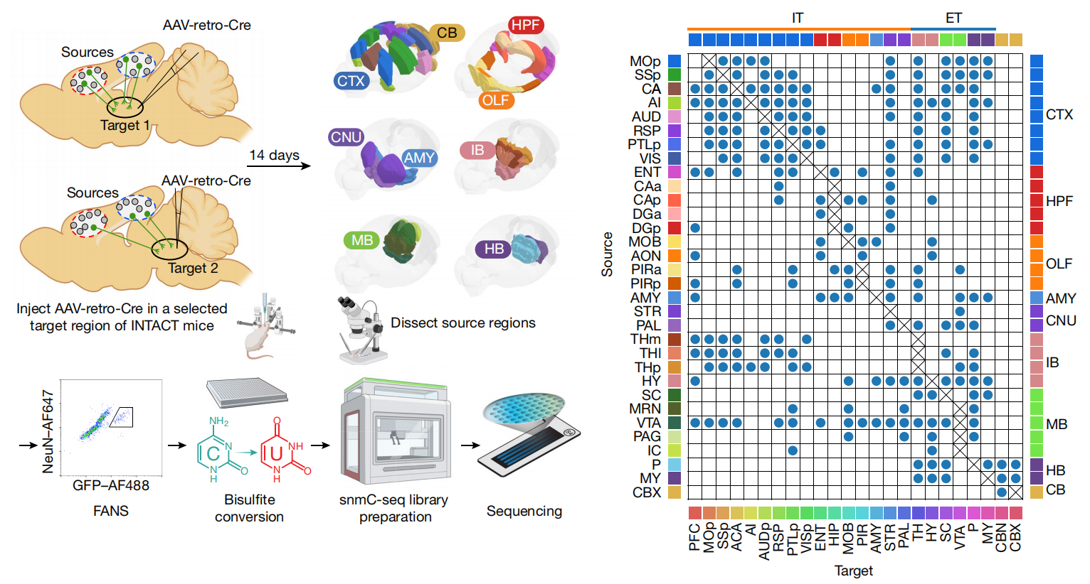 该团队研究人员利用Epi-Retro-Seq技术连接了整个小鼠大脑的32个不同区域、投射到24个不同目标的33,034个神经元的单细胞表观基因组和细胞类型,实现了对这些神经元远端投射的研究。该研究使得我们能够量化投射到不同目标脑区的神经元之间的遗传差异,对分子细胞类型及其投射目标进行注释,并构建相应的基因调控网络。