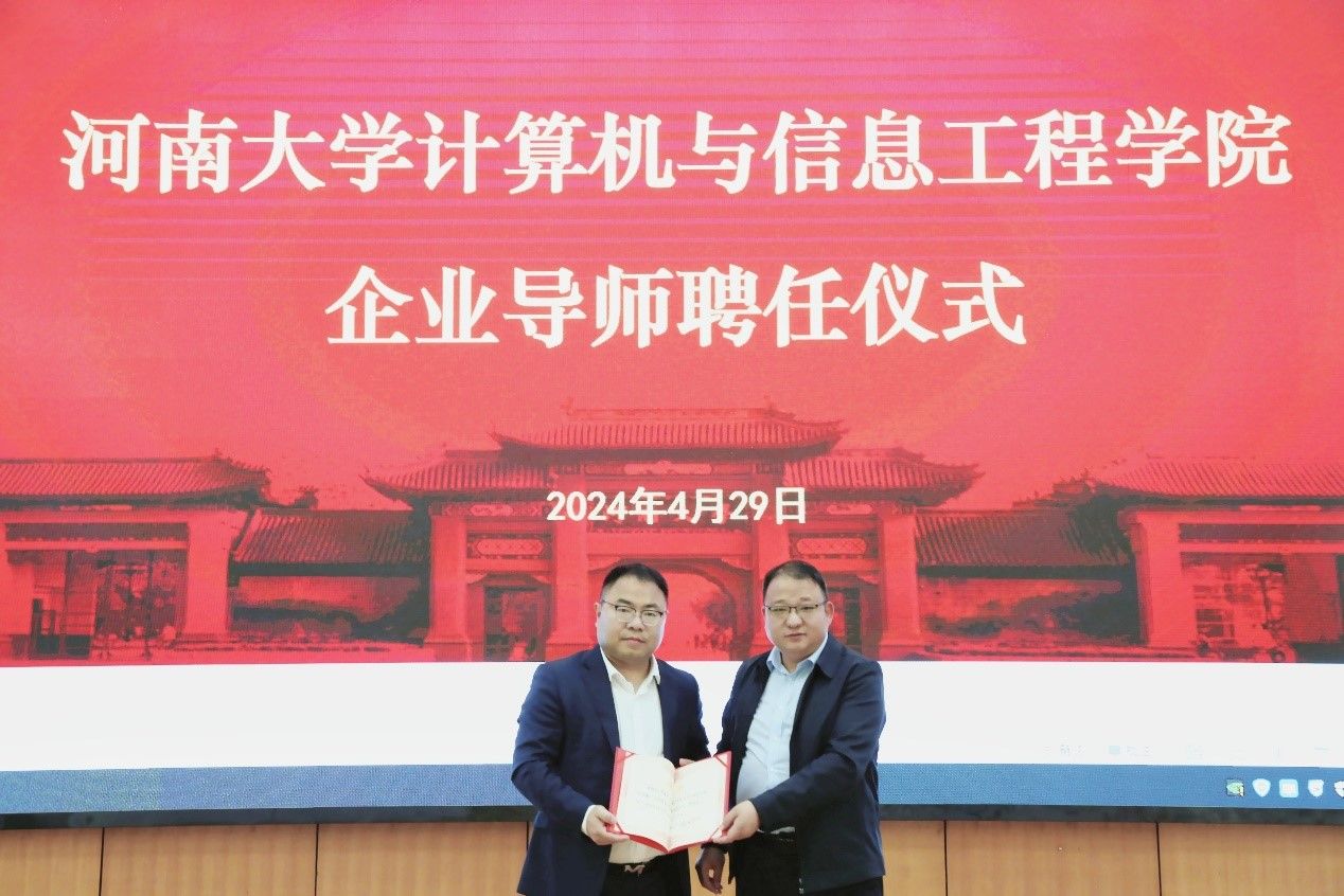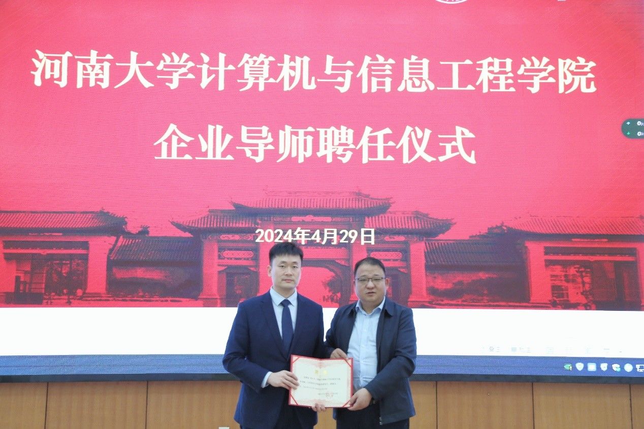 在201机房举行企业导师聘任仪式。学院领导班子成员、牧原食品股份有限公司首席智能官张玉良、河南众诚信息科技股份公司董事邓国军等及学院教师代表、辅导员、学生代表参加仪式,仪式由学院副院长左宪禹主持。