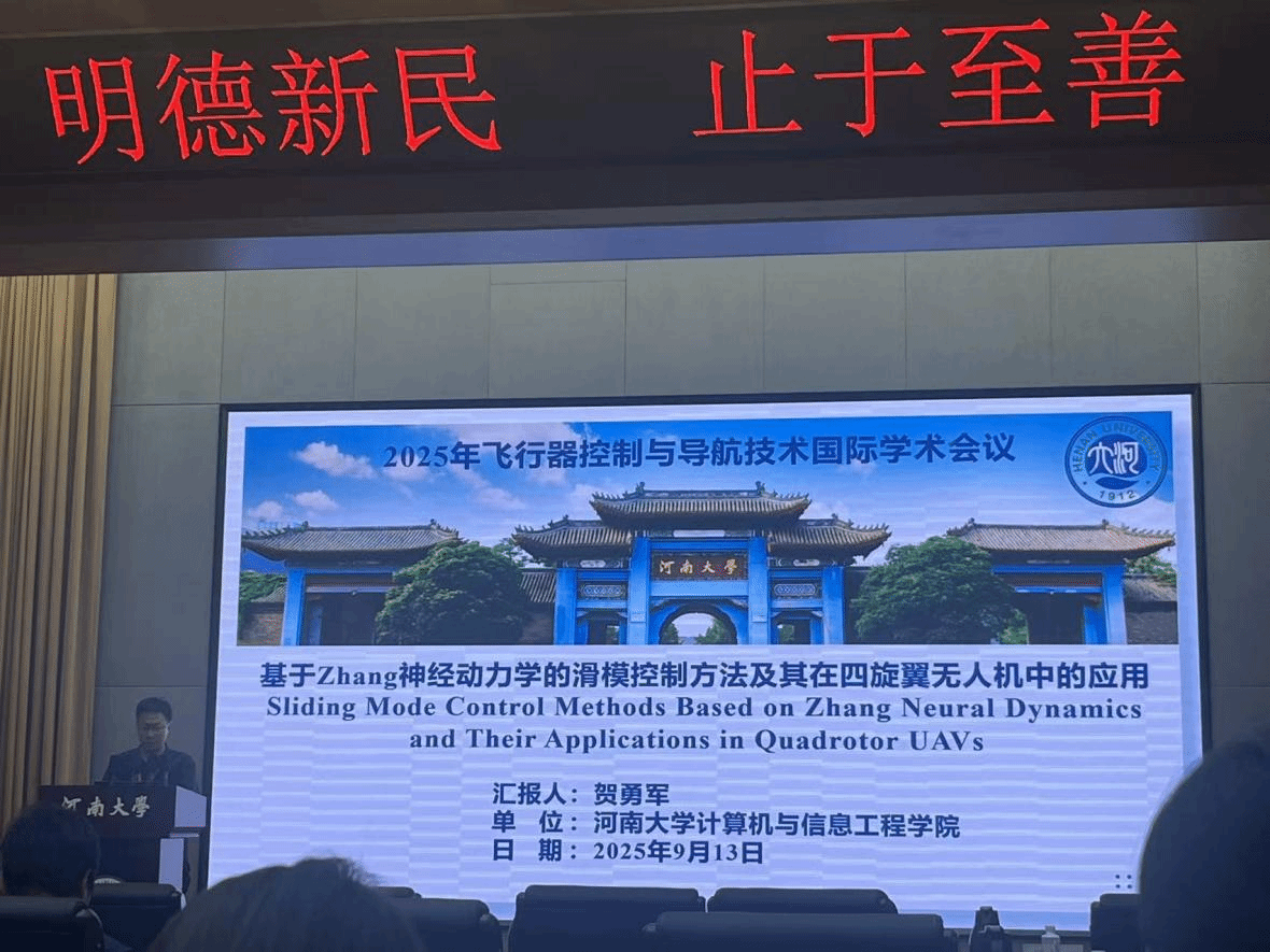 大数据智能处理团队贺勇军博士作了题为《基于Zhang神经动力学的滑模控制方法及其在四旋翼无人机中的应用》的精彩报告。他聚焦于Zhang神经动力学与滑模控制的融合创新机制、四旋翼无人机在复杂环境下的抗干扰控制策略,以及该技术在精准悬停、轨迹跟踪等实际场景中的落地应用,系统阐述了如何通过算法优化解决传统无人机控制中鲁棒性与动态响应难以兼顾的瓶颈。