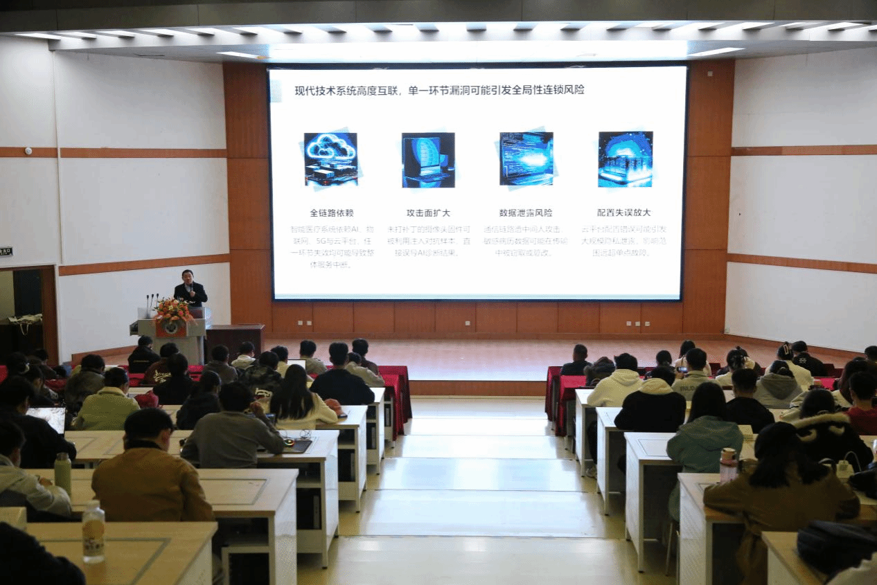 报告会上,王书州首先介绍了数字时代的特点“复杂性成为现实”,并基于这一特点,引出网络安全是保障系统整体可靠性的‘粘合剂’与‘压力测试仪’。随后,他围绕多学科技术融合的安全挑战与应对,介绍了AI的安全风险,指出智能与脆弱并存是当下人工智能所面临的问题。报告中,王书州高工以构建韧性系统--多学科协同的工程范式为主要内容进行讲解,详细介绍了网络安全、人工智能与软件工程等多领域协同支撑系统韧性建设。最后,他建议广大学子成为数字时代的T型人才并提供了关键行动与策略,从纵向深耕与横向连接两个方面进行行动,在主攻领域达到顶尖技术水平,主动学习相邻学科核心逻辑,夯实技术根基,理解其约束与协作接口。作为新时代技术人才,让我们不仅成为技术的创新者,更成为可信数字文明的坚定守护者。