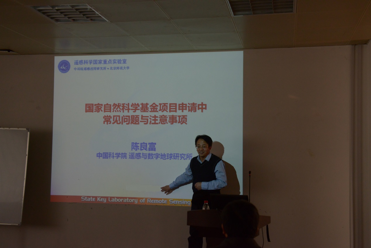 12月20日下午,中国科学院遥感与数字地球研究所大气研究室主任陈良富研究员在学院603会议室做了“国家自然基金申请中常见的问题与注意事项”的报告,报告会由学院副院长沈夏炯主持,郑逢斌院长及全体专任教师聆听了报告。