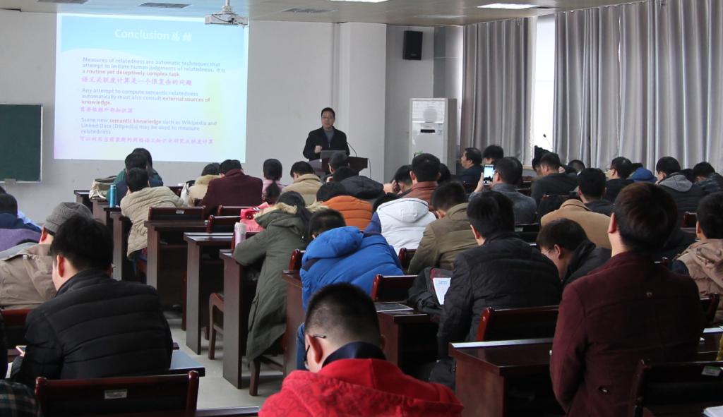 报告会上,蒋运承教授以语义分析为切入点,主要介绍了基于语义大数据的概念关联度计算及其在信息检索中的应用。蒋教授从自己的研究内容出发,详细介绍了语义关联度计算作为基础性研究在信息检索、拼写检测、文本分类、人工智能、自然语言处理等研究领域发挥的重大作用。会后,蒋运承教授就语义大数据技术和将来的发展与在坐师生进行了深度交流。