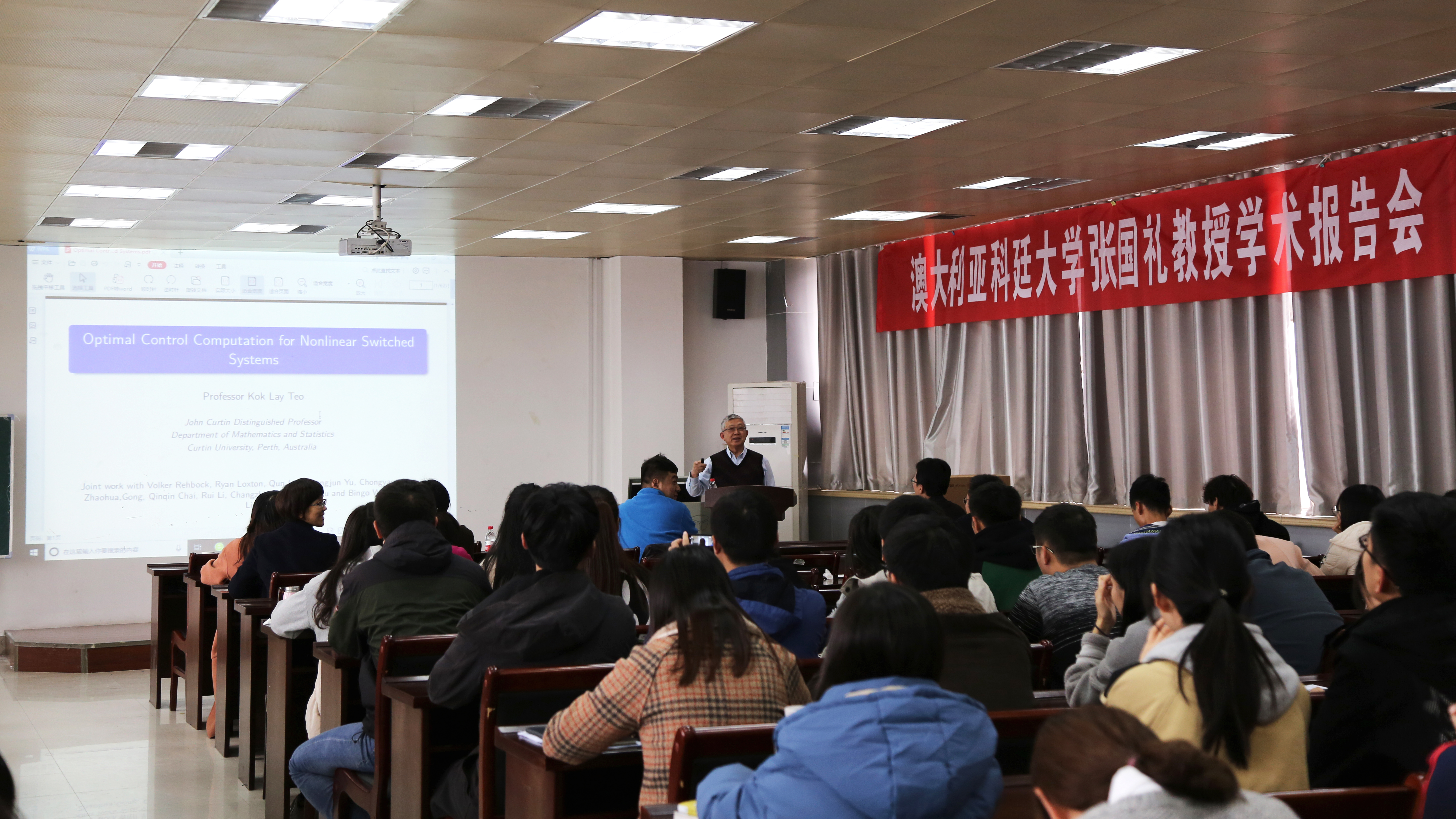 邀请,澳大利亚科廷大学Kok Lay Teo(张国礼)教授在院603会议室做了题为“非线性切换系统的最优控制计算”的学术报告。报告会由学院副院长韩道军主持,百余名师生聆听了此次报告。