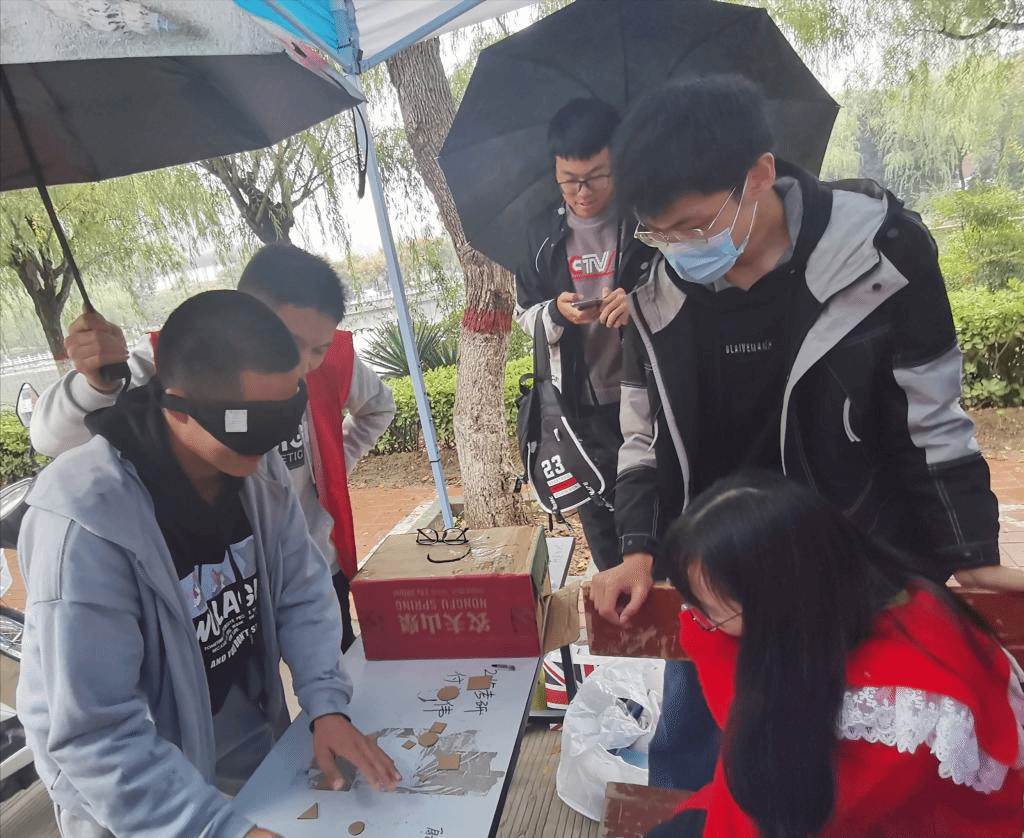 Before the start of the activity, volunteers made students understand the background of International Day for the Blind and its significance through online publicity, which aroused widespread concern. At 10: 00 on October 15, after a series of work such as pulling banners, setting tables and moving tents were completed in an orderly manner, the activity started as scheduled. Love surged in front of the No.2 complex building, and many students actively participated in the activity. Students either closed their eyes and painted according to the given words; Or blindfolded, sorting cards of different sizes by hand feeling. Students who participated in booth games left the light for a short time, perceived the world from the blind's point of view, and then understood the blind's living conditions, and had a deeper understanding of the blind social group. At the same time, volunteers also publicized the importance of rational use of eyes and eye protection to students, and popularized little knowledge about eye care. The game process was confused and the sight was blocked and it enables you to get out of the comfort zone and feel the darkness. The game process is also full of gains when the simple and easy games can make people get new life experiences and feelings during stumbling. At 7 o'clock in the evening, the activity came to an end with the fading sky.