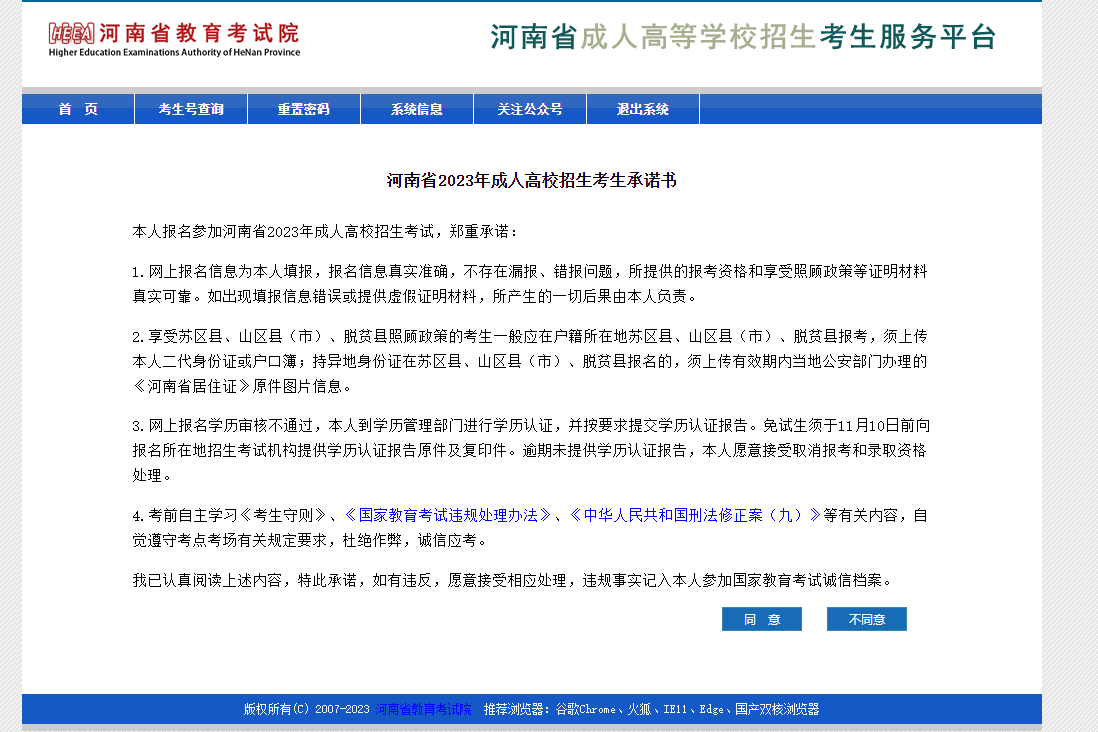 第三步:点击“新考生报名”,如图一;出现《河南省2023年成人高校招生考生承诺书》点击“同意”,如图二所示:
