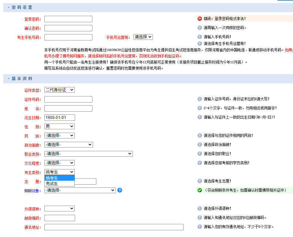 第五步:根据系统要求,录入个人相关信息。考生类别有“统考生”和“免试生”,“二学历”考生选择“免试生”;考生可根据自己的情况进行“照顾对象”选择 。