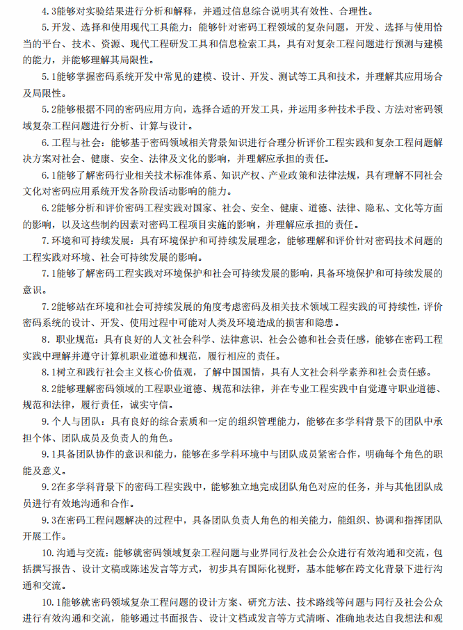 密码科学与技术专业的培养目标是:培养德、智、体、美、劳全面发展,具有良好的科学素养和职业道德,系统掌握密码科学领域的基本理论、专业知识、基本方法与基本技能,能运用所学知识与技能分析和解决密码科学或相关领域的复杂工程问题;培养具有良好的创新意识、团队沟通合作能力、国际视野、团队合作与沟通能力、自主学习和终身学习能力,具备扎实的密码学理论基础和密码协议、密码分析、密码工程等实践能力,具有较强的法律意识,系统掌握密码学基础理论和相关前沿知识,能够在密码科学或相关信息技术领域从事密码科学与技术相关科学研究、应用开发、管理运维等工作的高素质创新型人才。