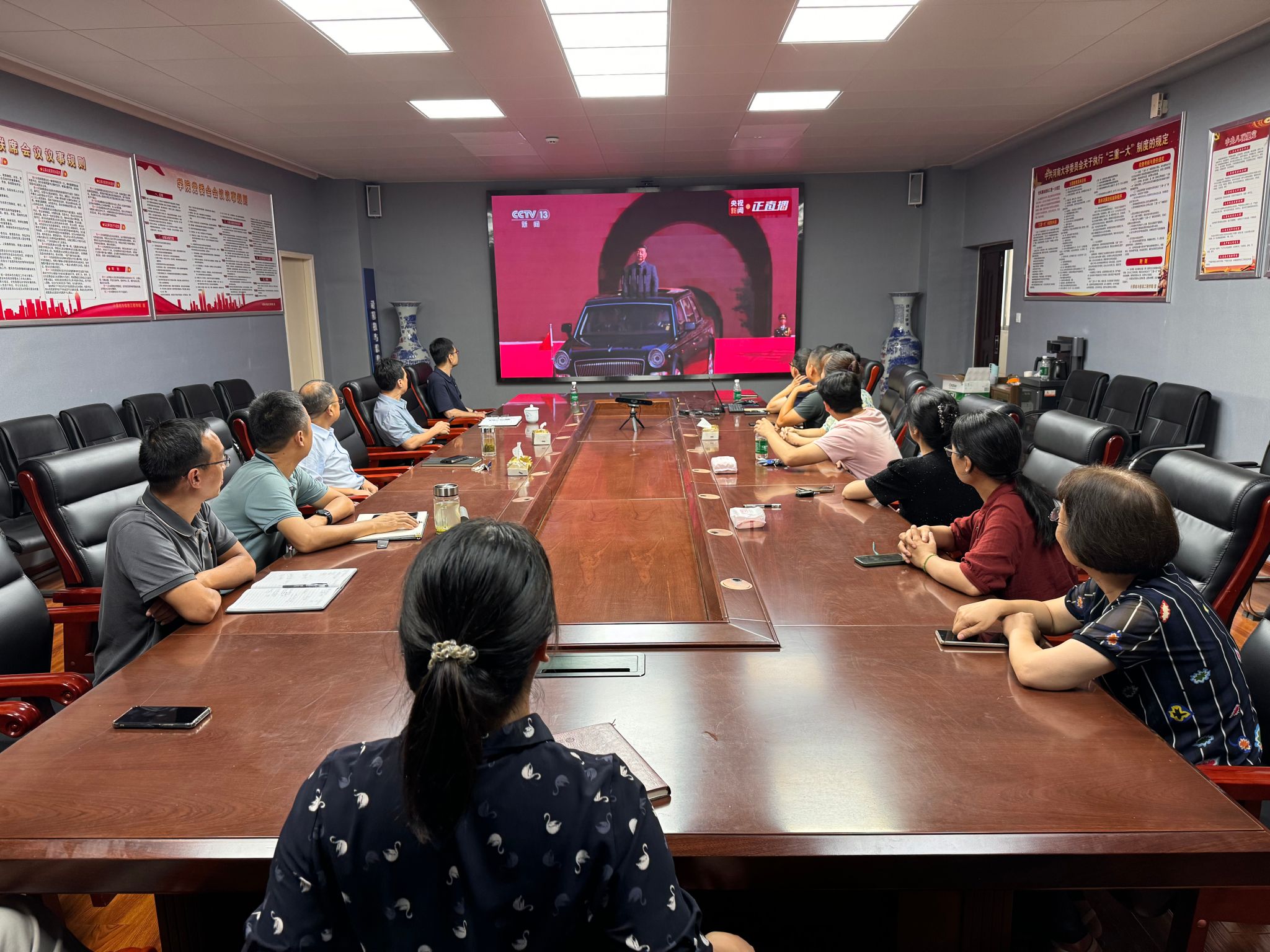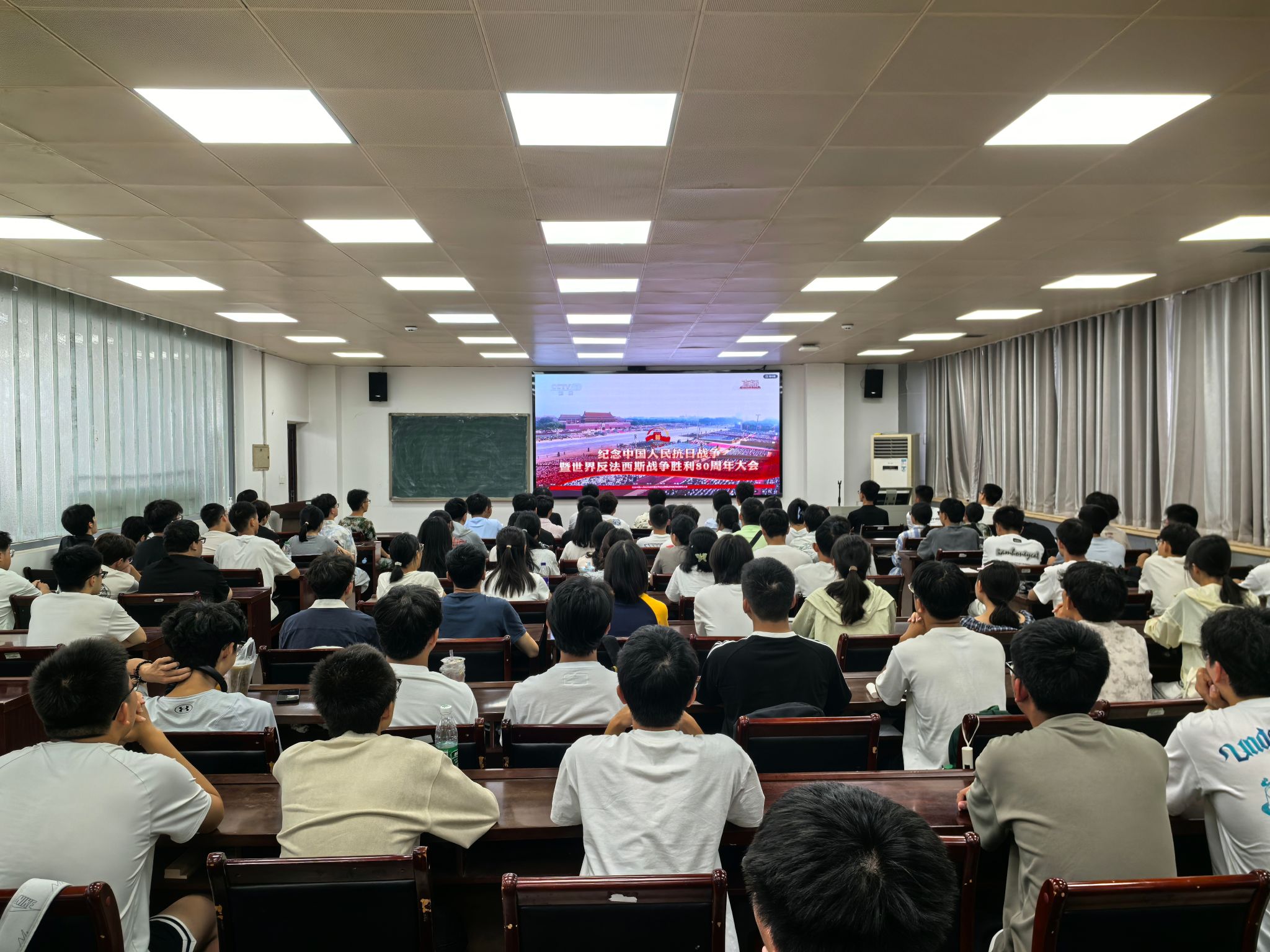 于2025年9月3日上午组织学院师生集体观看了纪念中国人民抗日战争暨世界反法西斯战争胜利80周年阅兵仪式,学院教职工集中在302集中收看阅兵直播,研究生和本科生在学院603集中收看。