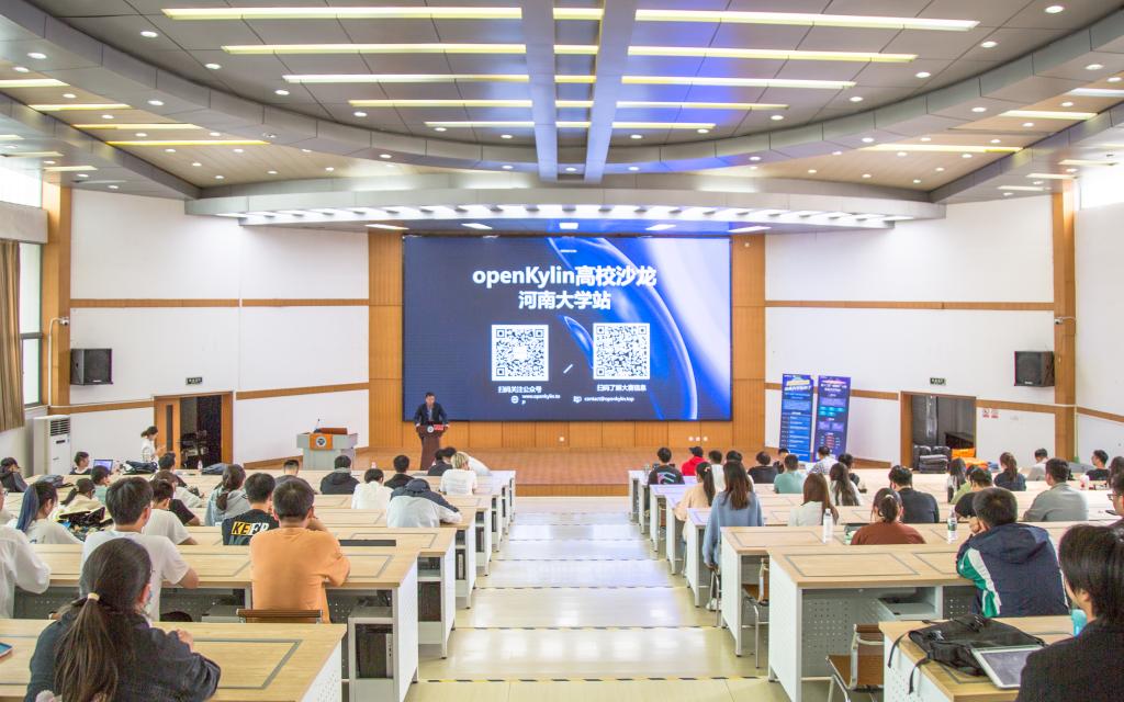 表示欢迎,并向与会学生介绍了开源社区基本情况,并号召大家积极参与“麒麟杯”大赛,在实践中提升专业能力。余杰在活动致辞中,号召同学们重视基础研究,投身基础研究,为国家基础研究做出贡献。openKylin社区UKUI SIG Maintainer席博文带来《openKylin开源社区及生态建设实践》的主题分享。鉴释科技编译器工程师董一帆给现场的同学们介绍了基于Open64和LLVM的RISC-V高性能编译器Xcalcompile,同时分享了个人求学和实习经历,为同学们学习工作带来新的思考。随后鉴释科技创始人兼CEO梁宇宁向同学们展示了全球首款RISC-V开发笔记本电脑ROMA的相关设计与功能以及后续计划。数科网维软件开发工程师张国辉围绕《签章和打印控制组件开发使用》进行主题分享。